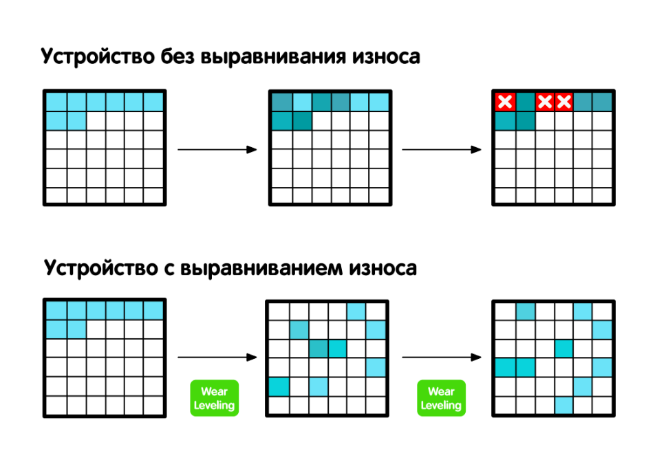 Не стоит забывать про работу контроллера, который самыми разнообразными способами стремится минимизировать количество перезаписей ячеек. Один из алгоритмов — выравнивание износа (Wear Leveling). Контроллер ведет учет количества циклов для каждой конкретной ячейки. Это позволяет при записи перераспределять информацию так, чтобы износ каждой из ячеек накапливался равномерно.