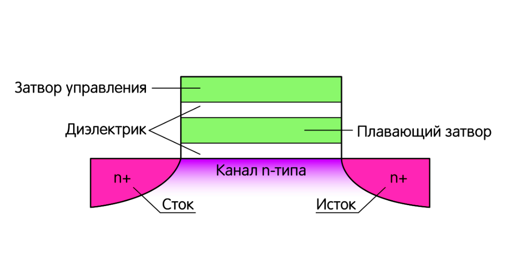 Заряд («1» или «0») хранится в плавающем затворе. Изменение выполняется путем приложения на затвор заданного напряжения, после чего электроны через слой диэлектрика проходят в одну или другую сторону.