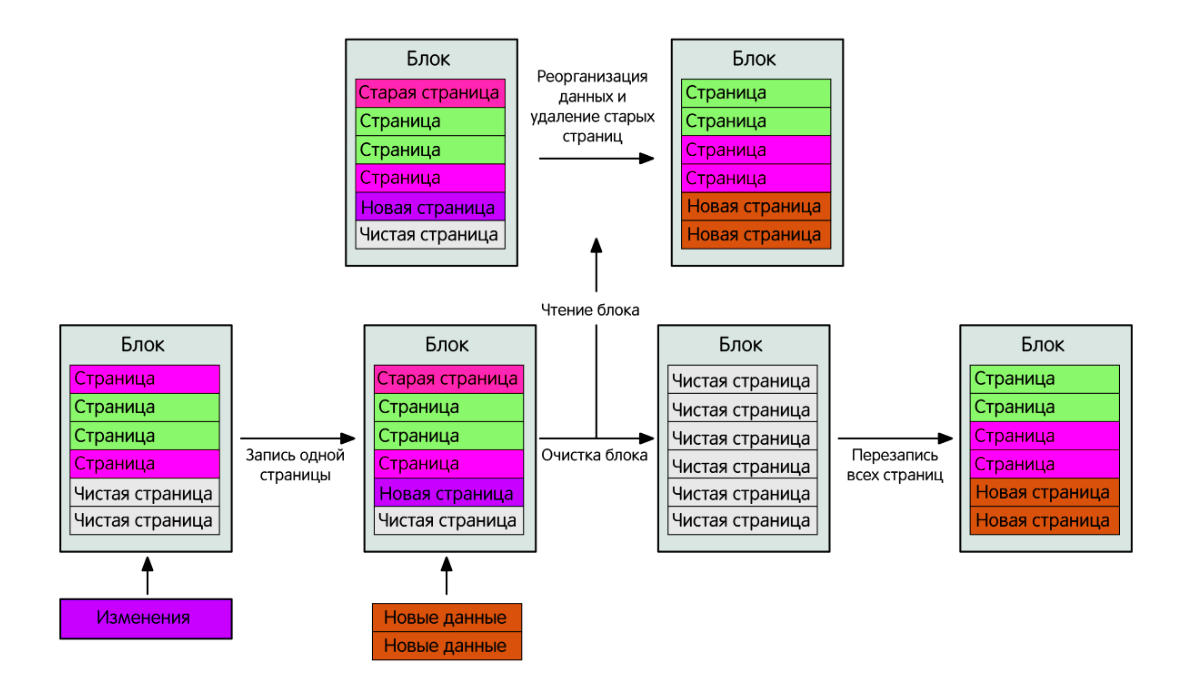 Однако ресурс каждого конкретного SSD диска во многом зависит не от самой флеш-памяти. Ключевыми являются алгоритмы, которые использует контроллер в процессах записи-перезаписи. Ячейки памяти объединяются в страницы, а те в свою очередь формируют блоки. Записать данные можно только в чистую страницу, а если их не хватает, то приходится переписывать блок.