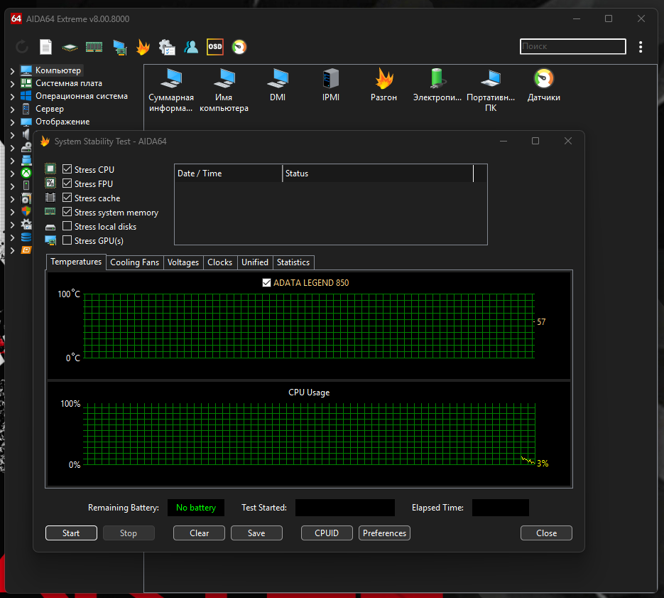 Чтобы запустить тест процессора, в главном окне выбери раздел «Stability Test», затем «CPU+RAM», настройки можете использовать как у нас на скриншоте. Нажми на зеленую кнопку START внизу, дождитесь 10 секунд и подтвердите снова.