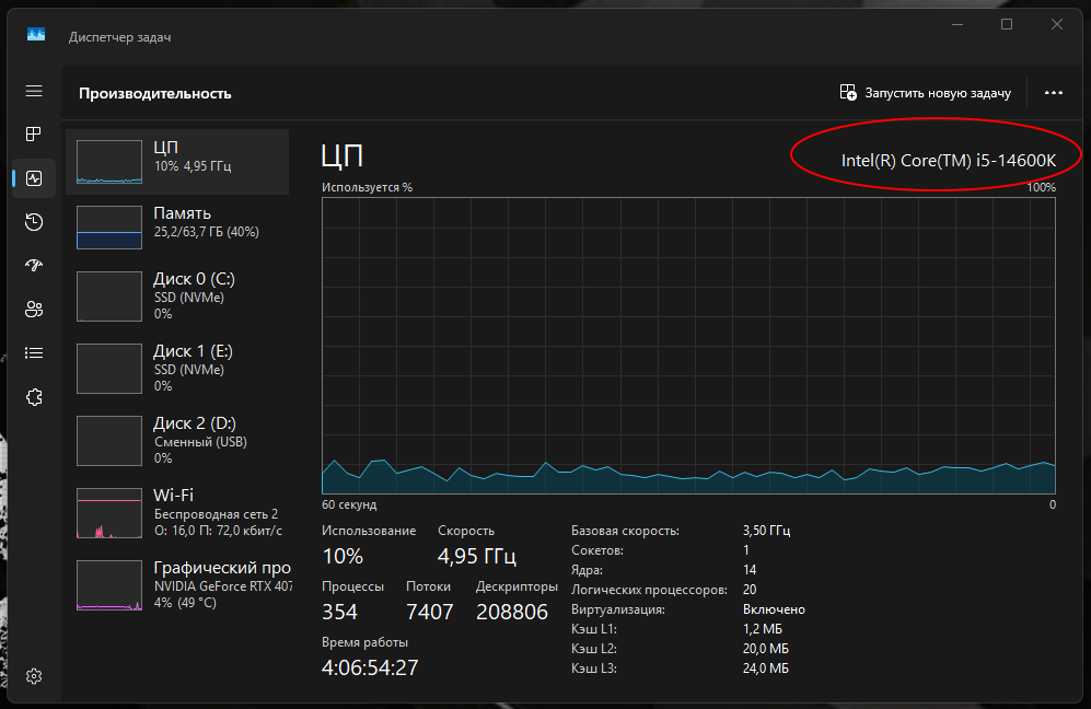 В операционной системе можно открыть "Диспетчер задач" через комбинацию Esc+Shift+Ctrl. Перейти во вкладку "Производительность" и раздел "ЦП".