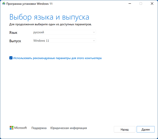 - На следующем экране снимите галочку «Использовать рекомендуемые параметры для этого компьютера», чтобы выбрать язык системы. В поле «Версия» будет указано «Windows 11».