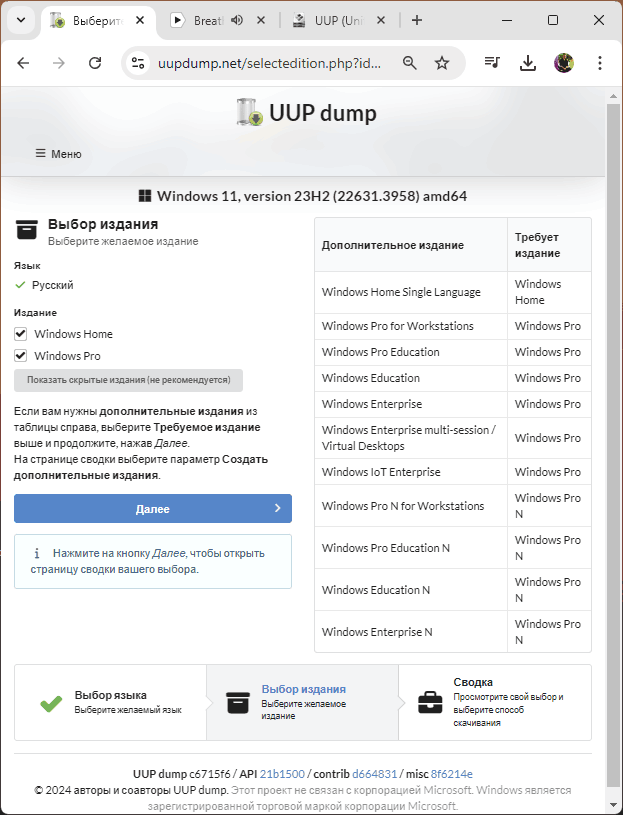 - В процессе загрузится образ 64-битной версии с несколькими редакциями (Pro, Home). Нажмите «Далее» для продолжения.