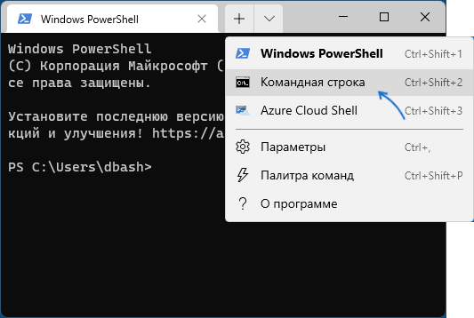3.Откроется окно терминала Windows, но по умолчанию в нём будет открыта вкладка PowerShell.