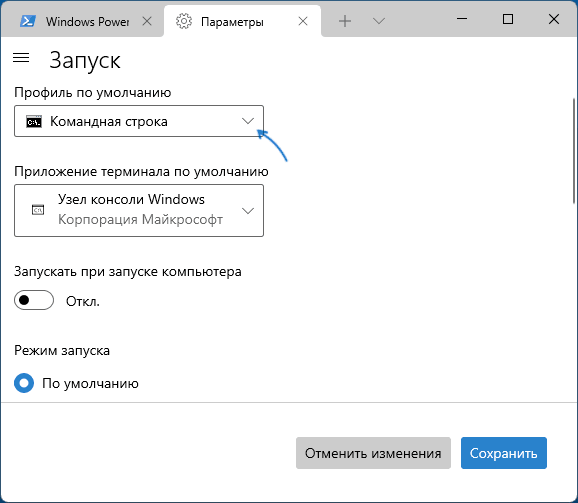 Примечание: при желании вы можете зайти в Параметры Windows Terminal (нажав по той же кнопке со стрелкой вниз) и выбрать «Командная строка» в поле «Профиль по умолчанию», если вам обычно требуется именно её запуск.