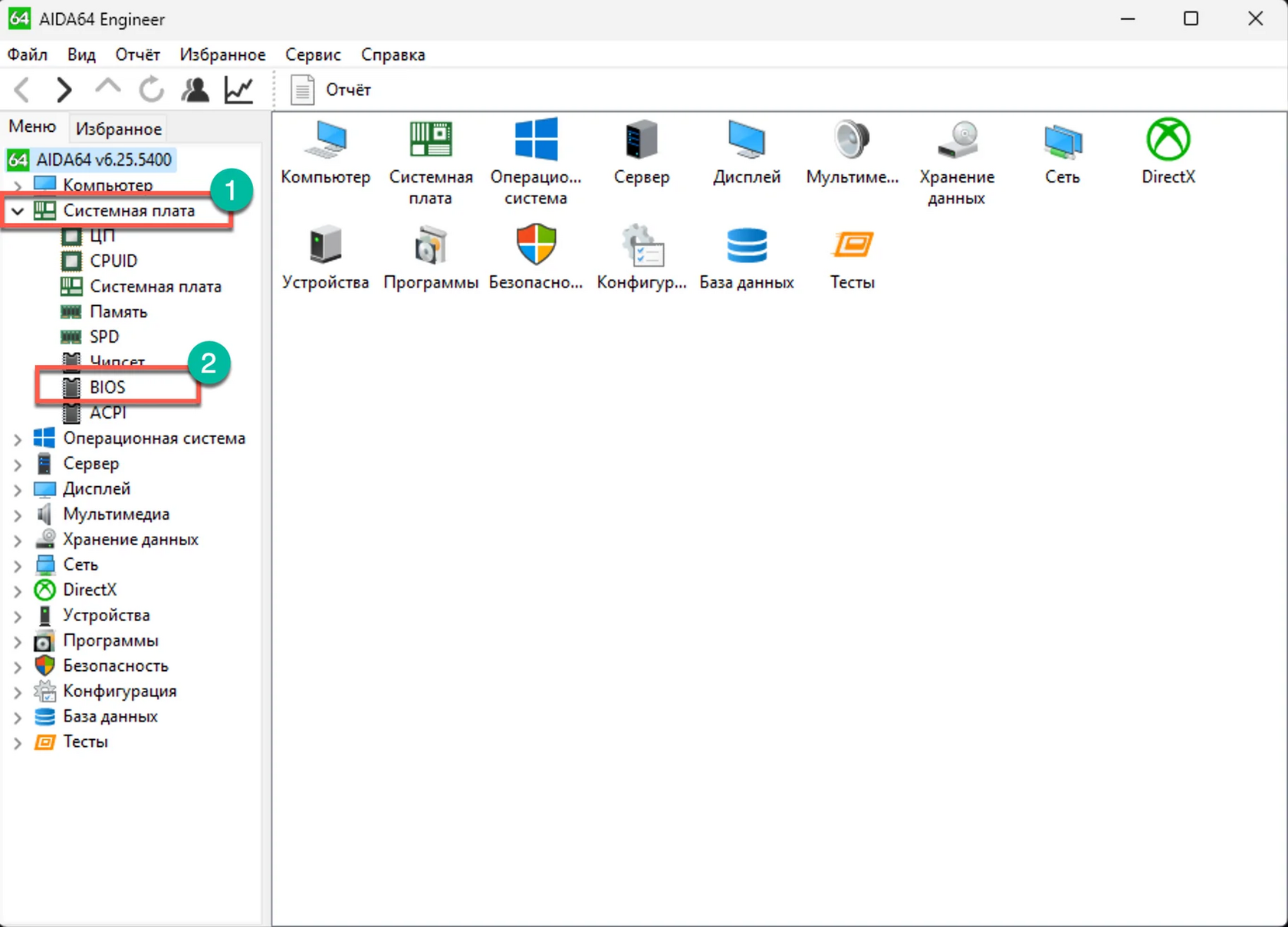 - Запустите AIDA64 и в левом меню раскройте раздел «Системная плата».