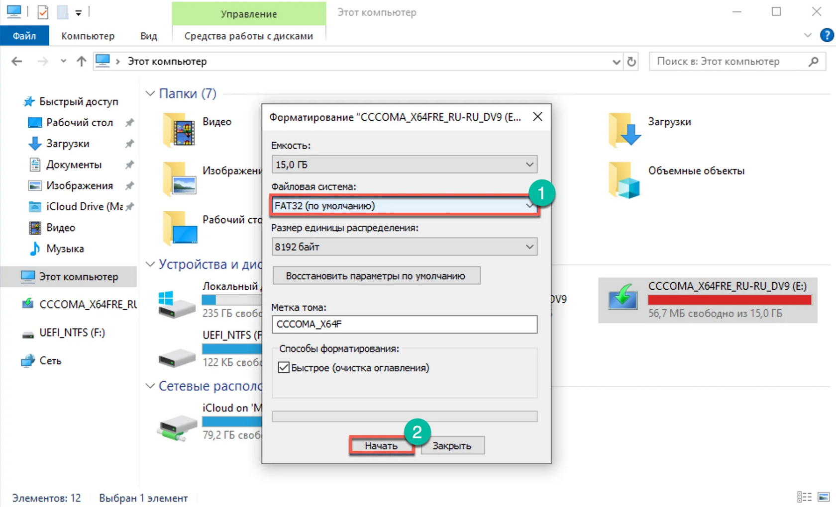 - В диалоговом окне форматирования установите FAT32 в качестве файловой системы и нажмите кнопку «Форматировать».