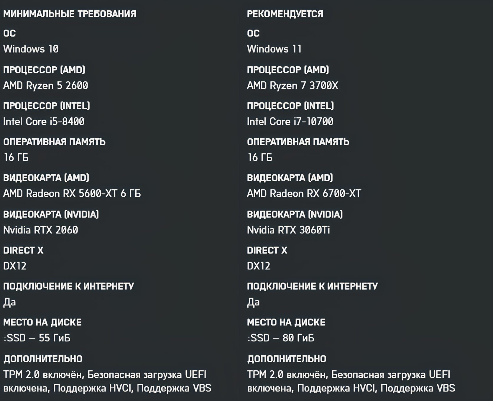 * Комфорт (1080p/1440p Высокие/Ультра, 60+ FPS): Ориентируйтесь на рекомендованные требования (Ryzen 7 3700X, RTX 3060 Ti / RX 6700 XT, 16 ГБ RAM) *как абсолютный базис*. Для лучшего опыта берите более современные аналоги или производительнее (i5/Ryzen 5 7600 + RTX 4070/RX 7800 XT, 32 ГБ RAM).