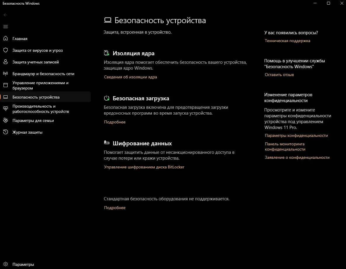 Вы также можете проверить статус через раздел безопасности Windows. Для этого откройте «Параметры» системы, перейдите в раздел «Конфиденциальность и защита», затем выберите «Безопасность Windows». В открывшемся центре безопасности найдите и нажмите на плитку «Безопасность устройства». Внутри, в разделе «Изоляция ядра», будет отображен текущий статус безопасной загрузки, а также состояние виртуализации. Это наглядный графический способ проверить активацию ключевых функций безопасности.