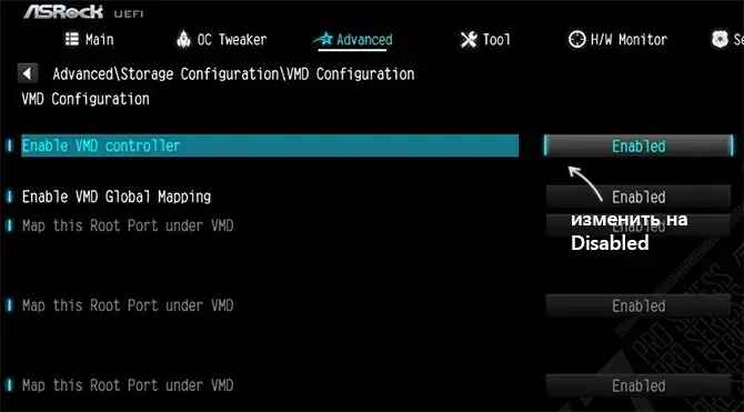 2.Найдите раздел для отключения контроллера VMD в БИОС, обычно он располагается на вкладке Advanced, иногда в подразделах, например: System Agent Configuration — VMD Setup Menu, Storage Configuration — VMD Configuration и других.