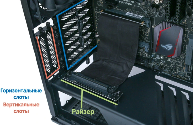 Вертикальные слоты встречаются редко и преимущественно у геймерских моделей. Для их использования потребуется райзер — специальный кабель, позволяющий подключить видеокарту в вертикальную позицию.